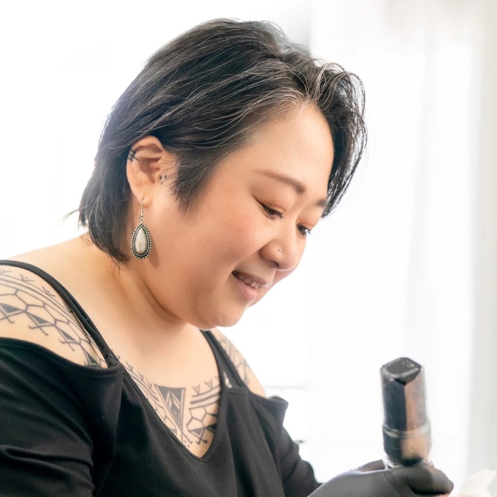 ハワイやタヒチ、サモア、ニュージーランドのマオリ族など、ポリネシア圏の部族柄(トライバル柄)を専門とする女性彫師。