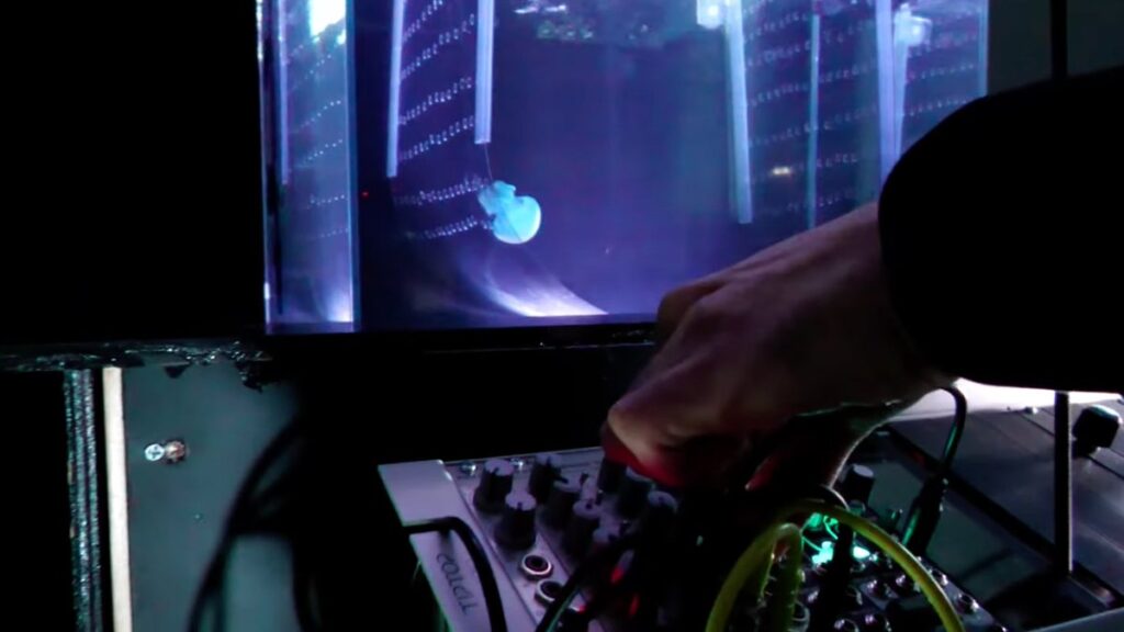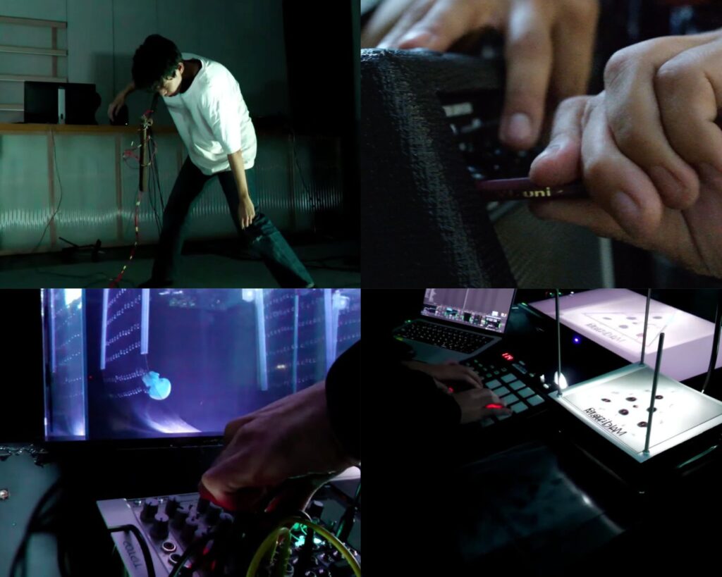 作品名:“Bio-Analog Resonance” /Kenshiro Taira, Ryoho Konayashi, Yuta Uozumi, Shinya Fujii/本作品は、クラゲの拍動をリアルタイムに検出し、アナログ⾳響システムへ変換するライブ・パフォーマンスです。モジュラーシンセサイザーと三線を使って、生命のリズムが生み出す新しい体験を提示します。/Acknowledgements: This work was supported by the JST [Moonshot R&D Program] Grant Number JPMJMS2215 and the Ishii-Ishibashi Fund (The Keio University Grant for Early Career Researchers).