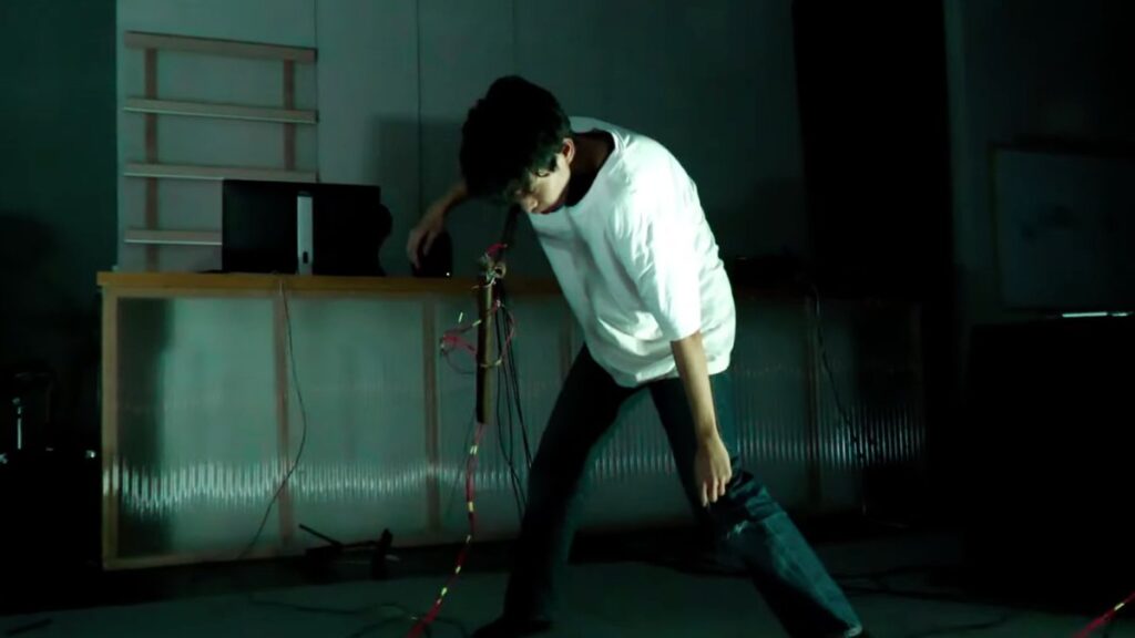 作品名: “symbiosis”/Takuma Kikuchi, Ryoho Konayashi, Yuta Uozumi, Shinya Fujii /本作は、機械と身体とのあいだで生じる相互作用を通して動きと音を生む即興身体パフォーマンスです。パフォーマーの身体に装着された機械が、周囲の状況や他者の操作に応じて駆動し、パフォーマーは駆動する機械に対して防ぐ・避けるなどの動作を行います。このやりとりを通じて、身体・音響表現が生まれます。/Acknowledgements: This work was supported by the JST [Moonshot R&D Program] Grant Number JPMJMS2215 and the Ishii-Ishibashi Fund (The Keio University Grant for Early Career Researchers).