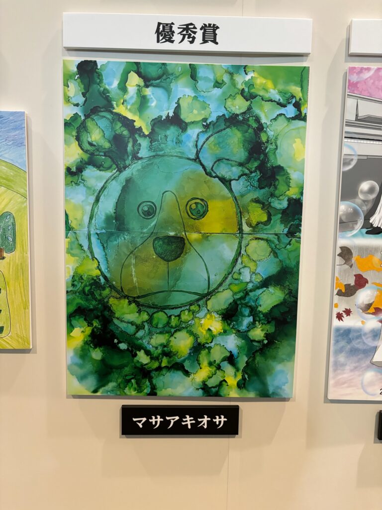 『車のフロントガラスから出た廃材をインクにしました。思いでの作品が素敵なSDGs活動に。地球に優しいアートです』
