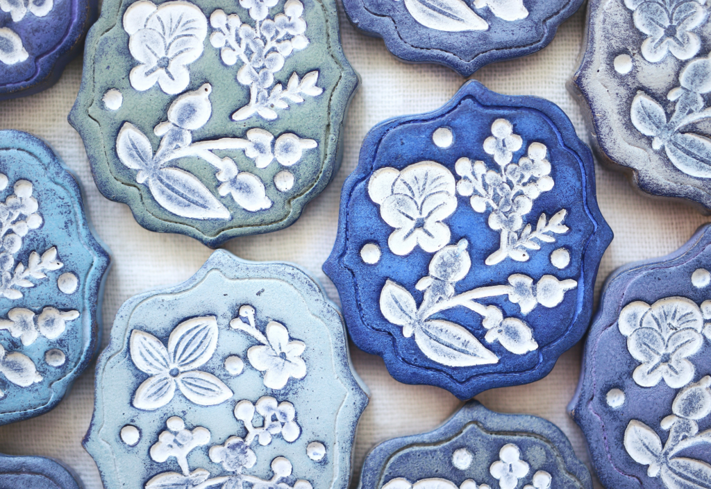 粘土を型抜きしたり、陶器のブローチに絵を描いて、