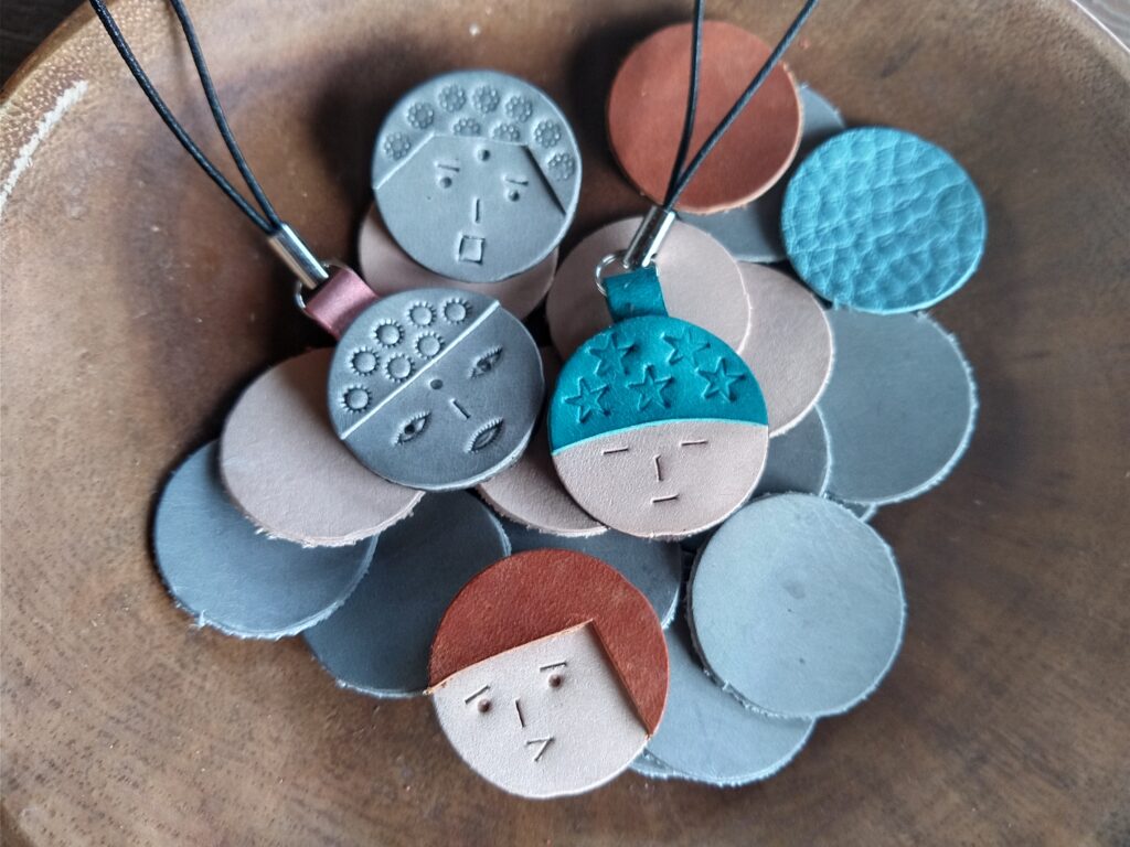 小さな革(形違い)を2つ選んで刻印を打っていただき、革ひもつけてお渡しします