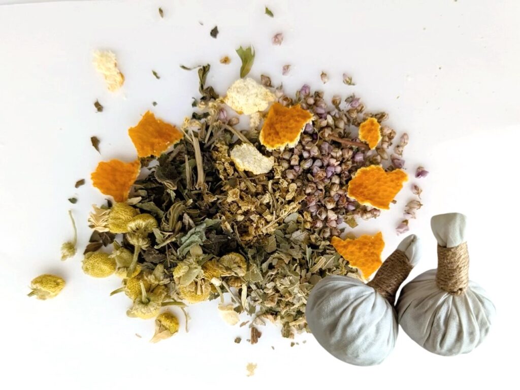 【香り×ハーブ×温】心も体もホッとゆるまるハーブのお灸・触れる、香る、五感で感じる癒しのワークショップ。数種のハーブを手で混ぜて布で包んで紐で結びます。ハーブを手でちぎったり、一つ一つ香りを楽しみながら出来上がったハーブボールで体に当ててポンポンやりあいっこ。子どもも大人も楽しめる体験で、自分や大切な人へのマッサージにも使えます。(※ご自宅で使う時はレンジで温めOK)